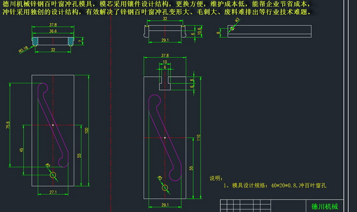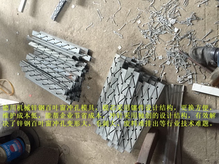 恒信彩 恒信彩锌钢百叶窗冲孔模具,模芯采用镶件设计结构,更换方便,维护成本低,能帮企业节省成本,冲针采用独创的设计结构,有效解决了锌钢百叶窗冲孔变形大、毛刺大、废料难排出等行业技术难题。