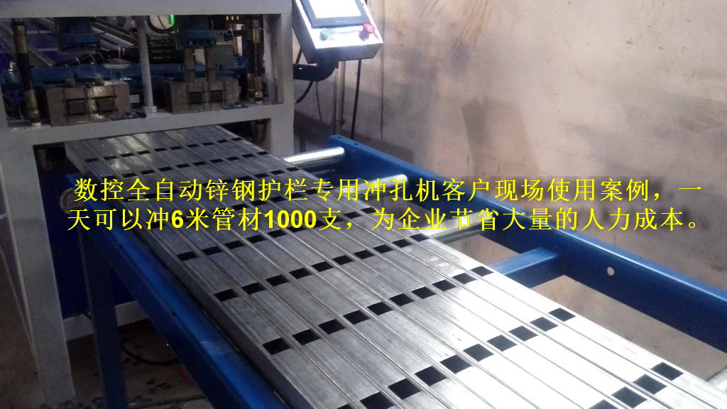 我司在管材冲孔设备多年的技术积累、良好的品牌效应的基础上研发出新一代两工位数控全自动液压冲孔机,比市场上同类型产品效率高50%,提高管材加工企业的效率,增加企业的竞争力;主要具有如下特点:一次可以同时冲4支管,最高速度可以达到每秒钟冲3个孔,一天可以冲6米管材1000支、防盗网1000平方;一支管上可冲双面孔、单面孔,两工位可以同时控制,也可以分开独立控制;采用人性化人机交互操作界面,不需要专业人员编程,可任意控制冲等距或不等距孔;各种型号冲孔参数可保存在系统内,用时只需要调出参数即可;可根据客户使用要求增加自动切料系统,可以同时进行自动冲孔、切料工作;系统完全自主研发,可根据客户的要求增加不同的功能;装模、换模简单,机台上有定位装置,模具对准定位装置后锁紧螺丝即可;广泛应用于不锈钢、防盗网、护栏、货架、金属家具、汽车配件、建筑材料生产企业等五金管件、型材冲孔、开料加工。